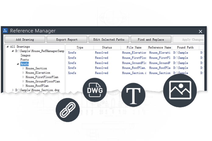 다른 DWG 파일을 외부참조로 연결해 협업 도면의 일관성을 유지합니다.